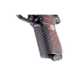 This robust, fast handling pistol wears our Wilson Combat engineered polymer Carry-2 grip module with 3-slot rail. This newly designed and manufactured grip has enhanced traction, smoother reloading, improved pointablity and superb recoil control in dynamic shooting. This grip turns an already solid platform into an ergonomic shooting machine.